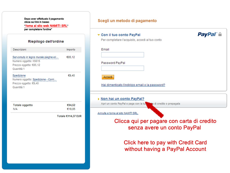Una volta selezionato il metodo di pagamento con carta di credito, verrai re-indirizzato automaticamente alla pagina di Paypal e lì potrai fare la tua scelta, utilizzando il sistema Paypal e l'account collegato o utilizzare il sistema Paypal senza avere un account Paypal.
