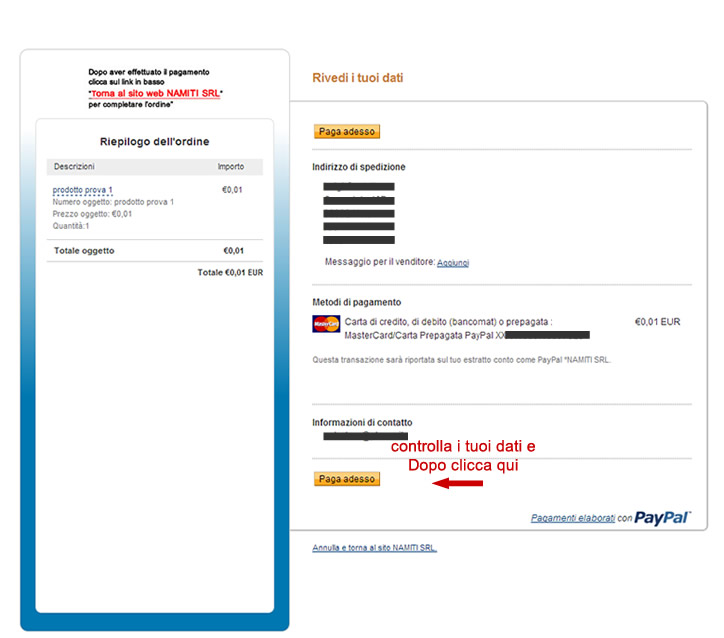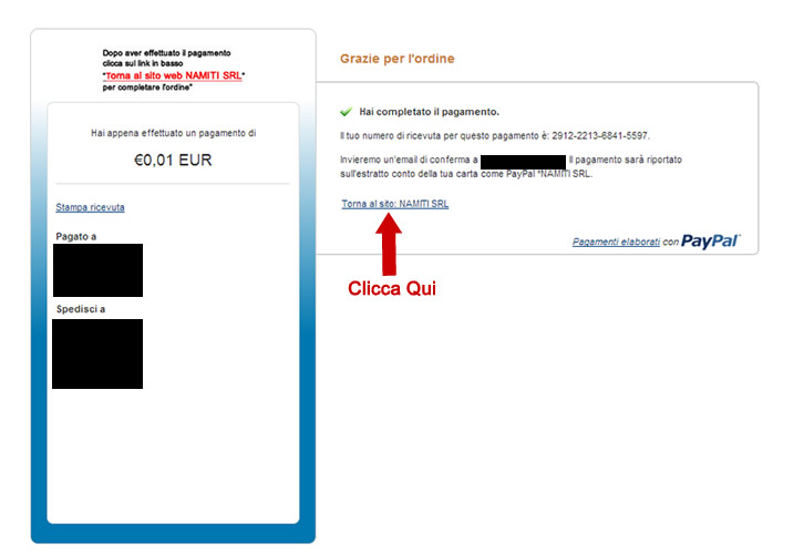Dopo aver effettuato il pagamento si prega di cliccare sul link "torna al sito NAMITI SRL" per completare l'ordine.