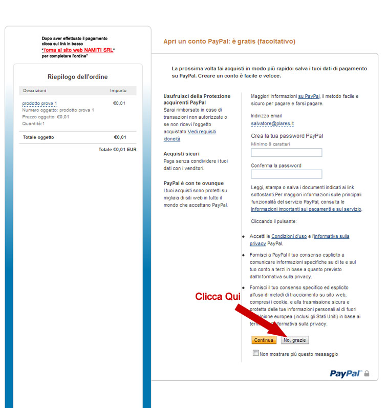 2. Se non hai un conto Paypal, se non vuoi creare un conto Paypal o se la carta di credito collegata a Paypal è al momento senza fondi, basta cliccare semplicemente sulla voce "Non hai un conto Paypal?"