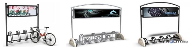Il portabici con spazio pubblicitario, è una particolare rastrelliera dotata di un cartellone che consente l’affissione di messaggi pubblicitari, o semplicemente di informazioni utili, come orari dei treni, autobus o eventi cittadini.